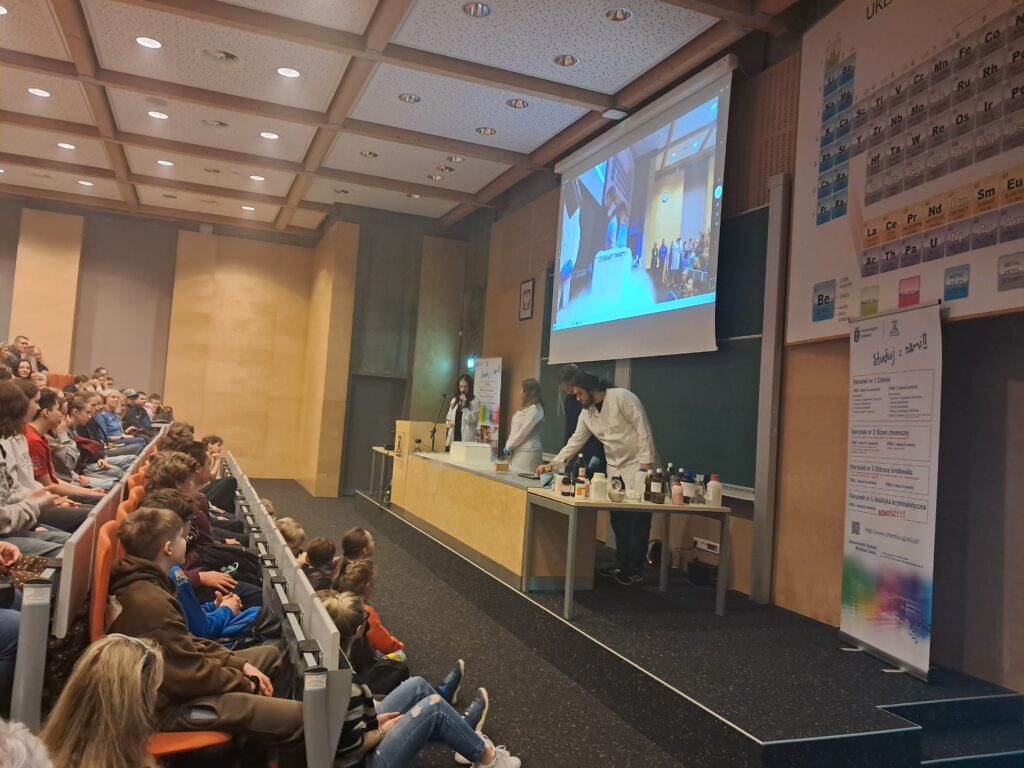 W trakcie wydarzenia działo się naprawdę dużo, a szczególnym zainteresowaniem cieszył się pokaz dla uczniów szkół podstawowych „Chemia Szlakiem Gwiazd”. Efektowne doświadczenia, zmieniające się kolory i widowiskowe reakcje po raz kolejny zafascynowały zarówno uczniów, jak i nauczycieli.